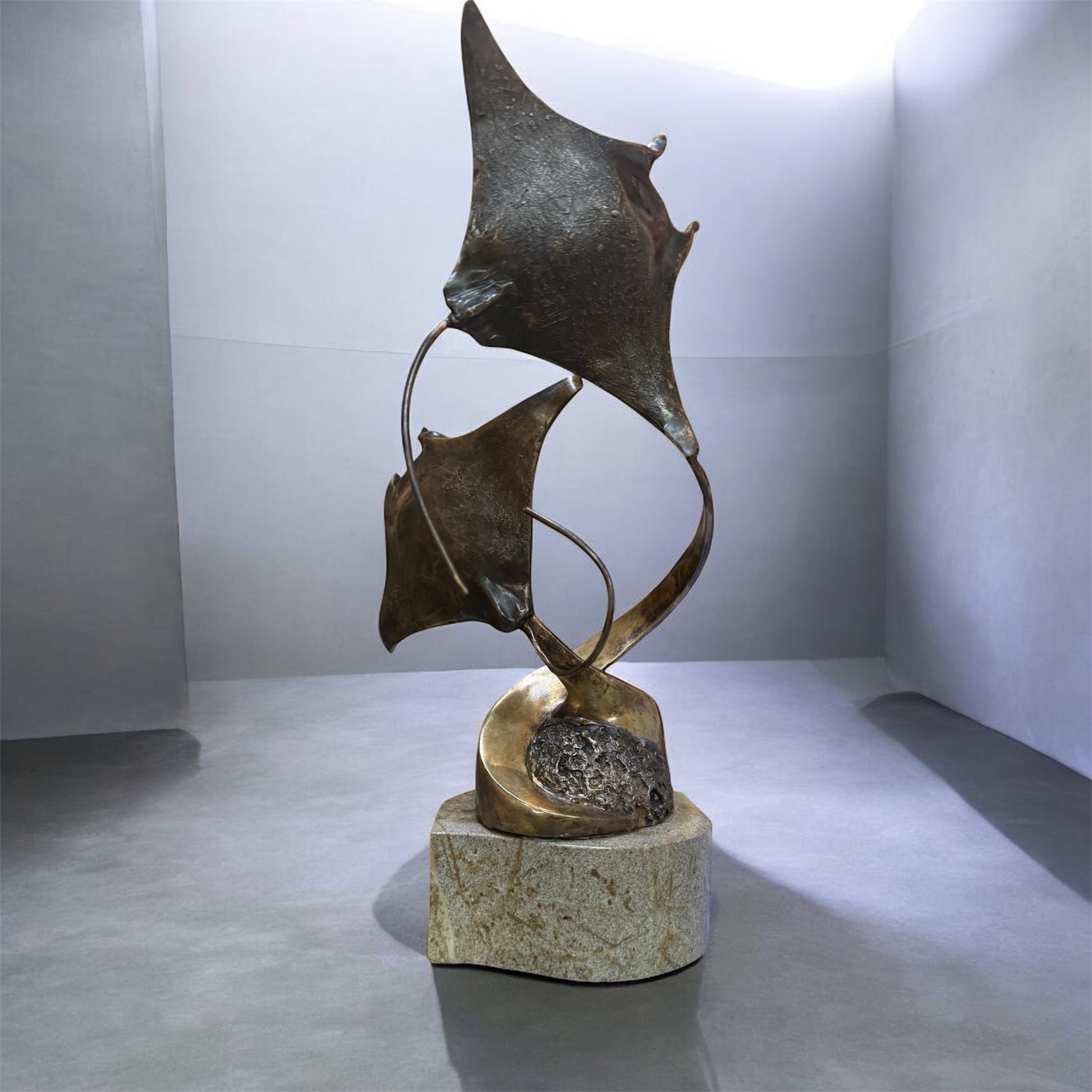A bronze sculpture depicting a pair of Manta Rays, capturing their gracefulness fluidity and sweeping movement that's typical of Manta Ray's in the water. The form is elegant and stylised with smooth, curved wings with their natural graceful motion, as if caught mid-glide.